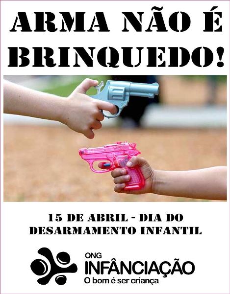 Você sabia que no Brasil e em todo o mundo existem crianças que utilizam armas de fogo? Triste, hein? Mas foi criada uma data comemorativa que lembra a importância de lutar pela paz mundial e que reforça o papel da criança na sociedade, que é estudar e brincar bastante. Estamos falando do dia 15 de abril, Dia do Desarmamento Infantil. Nessa data, lembramos que uma criança nunca deve utilizar e nem brincar com armas de fogo (nem com as de brinquedo).