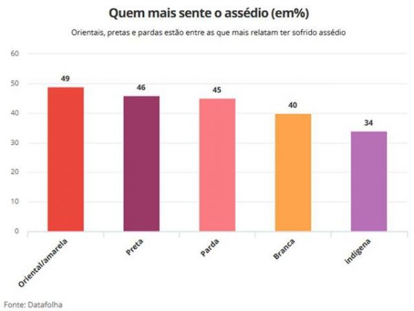 A pesquisa revelou também que os relatos de assédio são maiores conforme o tamanho da cidade. Nos municípios com até 50 mil habitantes, 30% dizem ter sido vítimas, enquanto nos que têm mais de 500 mil habitantes, a taxa sobe para 57%.