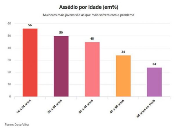 O índice de mulheres que relatam ter sofrido assédio sexual sobe para 45% se consideradas apenas as mulheres de 16 a 24 anos. Em relação ao nível de escolaridade, o percentual é maior entre as mulheres com nível superior – 44%, contra 13% das mulheres que têm até o ensino fundamental.