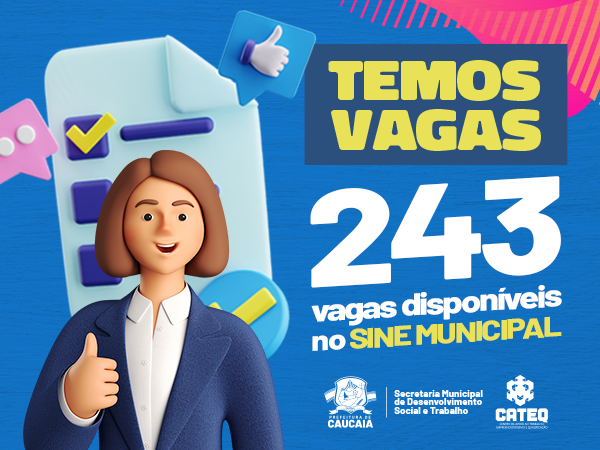 A Secretaria de Desenvolvimento Social e Trabalho (SDST), por meio do SINE, disponibiliza 243 novas vagas de emprego. Açougueiro, ajudante de serralheiro, atendente de lojas e supermercados, auxiliar de estoque, auxiliar de limpeza (PCD), auxiliar de linha de produção (PCD) e auxiliar de manutenção hidráulica e elétrica são algumas das vagas disponíveis.