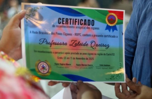 Na sexta-feira (14/11), a Rede Brasileira dos Povos Ciganos – RBPC, através da coordenação da região do Cariri, teve a honra de conferir o presente Certificado de Reconhecimento “Amiga dos Povos Ciganos” para à Professora Zuleide Queiroz, em agradecimento pela valiosa parceria e pelo apoio prestado aos povos ciganos na região do Cariri, Ceará.