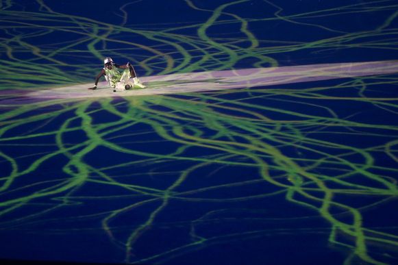 Logo depois, a cerimônia voltou no tempo, ao nascimento das imensas florestas que cobriam o Brasil na chegada dos portugueses. Do começo da vida, a homenagem avança até a formação dos povos indígenas, cuja entrada foi representada por 72 dançarinos das duas grandes agremiações do Festival de Parintins, os Bois Caprichoso e Garantido.