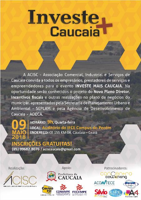 O Investe Mais Caucaia vai acontecer no dia 9 de maio, às 9h, no Campus do IFCE Pecém, numa parceria da ACISC, Agência de Desenvolvimento do Município de Caucaia – Adeca e Secretaria de Planejamento Urbano e Ambiental de Caucaia – Seplam.