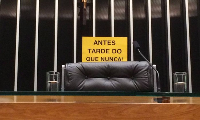 Após o encerramento da sessão, a deputada Maria do Rosário (PT-RS), ex-ministra da Secretaria Especial de Direitos Humanos, levantou-se e colocou uma placa na cadeira da presidência da Câmara, com os dizeres “Antes tarde do que nunca!”, em protesto.