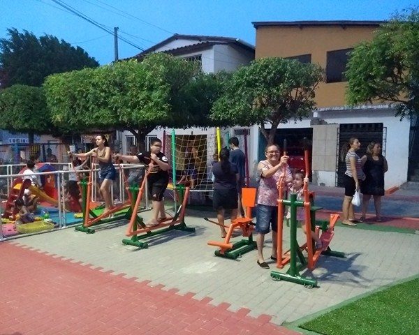 Academia ao ar livre do bairro Nova Metrópole é um espaço de convivência com 22 equipamentos, um parquinhos para 5 atividades lúdicas para as crianças, passeio,  163 metros de grama sintética, iluminação e paisagismo.