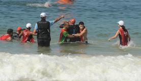 A primeira prova do paratriatlon, para quem não tinha pernas ou movimento nelas, foi 750 metros de natação, a partir de uma base próxima ao Forte de Copacabana, até o ponto de chegada nas areias da praia. Nesse ponto, os atletas foram recebidos por voluntários, que os carregavam nos braços até cadeiras de rodas.