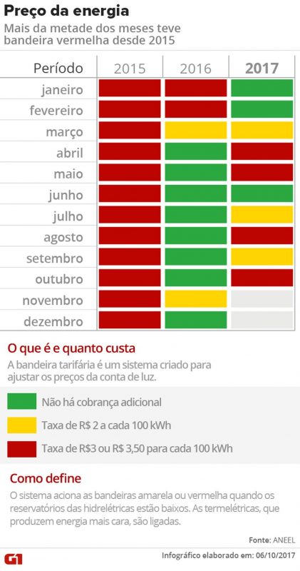 Na semana passada a Aneel anunciou que a bandeira ficaria na cor vermelha patamar 2 em outubro, o que obrigará os consumidores a pagarem a taxa extra mais cara. É a primeira vez que a bandeira fica na cor vermelha patamar 2.