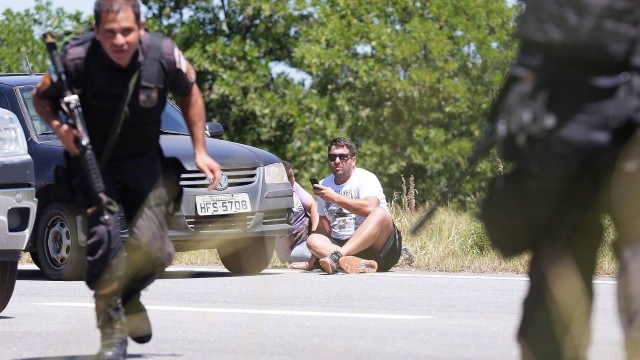 Um vídeo postado em redes sociais mostra o momento em que motoristas que estavam presos no engarrafamento ficam no meio do tiroteio.