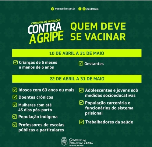 Crianças de 6 meses a seis anos e gestantes podem se vacinar durante todo o período de campanha estabelecido. Idosos com 60 anos ou mais, doentes crônicos, mulheres com até 45 dias do parto, população indígena, professores, jovens que cumprem medidas socioeducativas, população carcerária, servidores do sistema prisional e trabalhadores da saúde devem buscar as unidades de saúde a partir do dia 21 de abril.