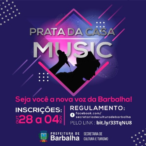 Estão abertas as inscrições para o projeto “Prata da Casa Music”, que será realizado em Barbalha, no período de cinco de novembro a 21 de dezembro. A iniciativa é desenvolvida pela Secretaria de Cultura e Turismo do Município com o intuito de promover os talentos amadores barbalhenses. As inscrições podem ser feitas até o dia 04 de novembro, exclusivamente pelo link .