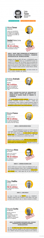 — Essa MP foi feita para reforma do setor portuário e ela ia trazer um grande prejuízo para o grupo Libra, que é um grupo aliado de Cunha e, por consequência, de Michel Temer, porque é um dos grandes doadores das campanhas de Michel Temer. Pela definição dessa MP, o grupo Libra não ia poder renovar mais as suas concessões portuárias. Por quê? Porque tinha vários débitos fiscais inscritos em dívida ativa. O que o Eduardo Cunha fez? Pôs dentro dessa MP uma cláusula que empresas que possuíam dívida ativa inscrita poderiam renovar seus contratos no setor portuário desde que ajuizassem arbitragem para discutir este débito tributário – afirmou o delator.