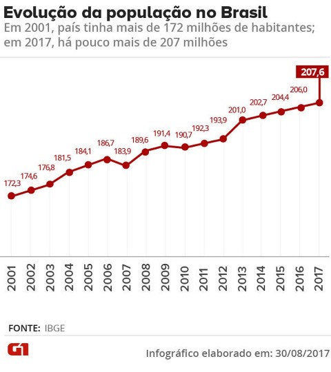 O Brasil tem 207.660.929 habitantes, segundo estimativa Instituto Brasileiro de Geografia e Estatística (IBGE) divulgada nesta quarta-feira (30) no Diário Oficial da União. A data de referência para o levantamento é 1º de julho. Em 2016, a população do país era estimada em pouco mais de 206 milhões habitantes.
