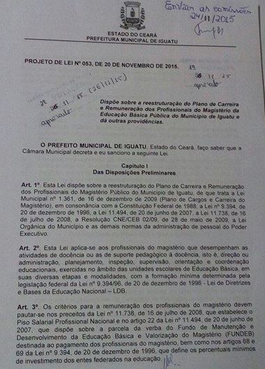 Neste ano o natal será uma data ainda mais especial aos profissionais da Educação de Iguatu Isso porque, o Projeto de Lei Nº 053/2015, de autoria do Poder Executivo, que dispõe sobre o plano de cargos, carreira e remuneração para os integrantes do quadro do magistério público foi aprovado por unanimidade, pela Câmara de Vereadores nessa quinta-feira, 26, durante duas sessões extraordinárias, que foi conduzida pelo presidente, vereador Rubenildo Cadeira (PRB). Por unanimidade os vereadores aprovaram o projeto que segue, agora, para sanção do prefeito, devendo entrar em vigor tão logo seja publicado no Diário Oficial do Município.