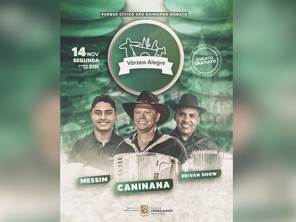 O prefeito, Zé Helder (MDB), informou na tarde desta quinta-feira, que o cantor Caninana do Forró se apresenta em Várzea Alegre na segunda-feira, 14 de novembro, as 21h, véspera de feriado. Nessa mesma festa se apresentam as atrações Messim e Erivan Show.