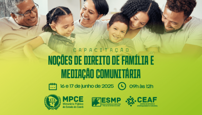 A Coordenação do Programa Núcleos de Mediação Comunitária (Pronumec) e o Centro de Estudos e Aperfeiçoamento Funcional (Ceaf), com o apoio da Escola Superior do Ministério Público (ESMP), realizará, nos dias 16 e 17 de junho, das 9h às 12h, a Capacitação “Noções de Direito de Família e Mediação Comunitária”. A ação ocorrerá em formato híbrido no auditório da ESMP/Ceaf, em Fortaleza, e será transmitida pela plataforma Microsoft Teams. A formação é voltada para os mediadores comunitários que atuam no Pronumec. Para participar e receber o certificado de 6h/aula, os interessados devem se inscrever previamente na plataforma de cursos da ESMP/Ceaf.