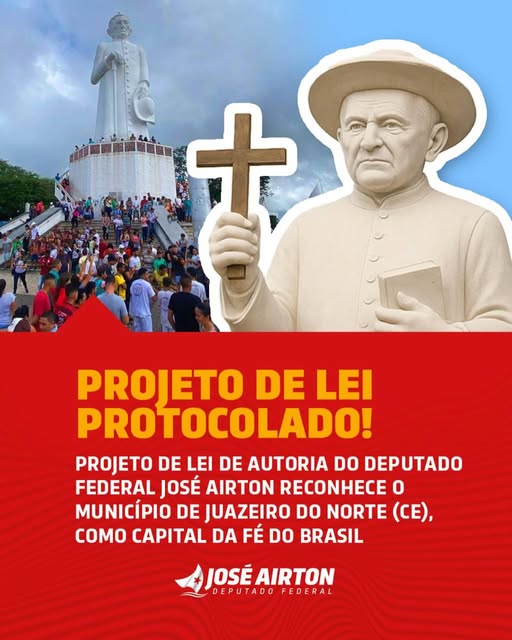 O deputado federal José Airton Félix Cirilo (PT-CE) apresentou nesta quarta-feira (16/7) o Projeto de Lei nº 3.454/2025, que propõe tornar o município de Juazeiro do Norte, no Ceará, como a Capital da Fé do Brasil.