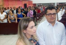 O prefeito Venicio do Ó ao lado da primeira-dama Carmelina Castro participa de culto...