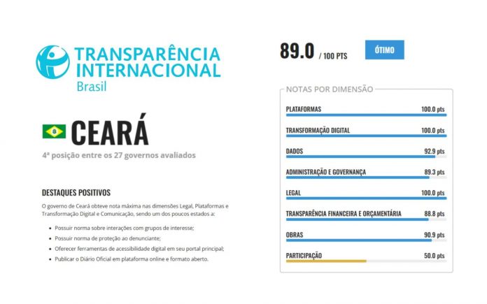 O Ceará conquistou mais um reconhecimento que reforça sua posição de referência em governança pública no Brasil. No Índice de Transparência e Governança Pública (ITGP) 2025, elaborado pela Transparência Internacional Brasil, o estado alcançou a 4ª colocação nacional, com 89 pontos de 100 possíveis, desempenho que garantiu a classificação na categoria “Ótimo”.