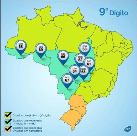 O nono dígito já foi implementado em São Paulo, Rio de Janeiro, Espírito Santo, Amapá, Roraima, Amazonas, Pará, Maranhão, Piauí, Ceará, Rio Grande do Norte, Paraíba, Pernambuco, Alagoas, Sergipe, Bahia e Minas Gerais. E ainda será implantado no Paraná, em Santa Catarina e no Rio Grande do Sul no dia 6 de novembro.