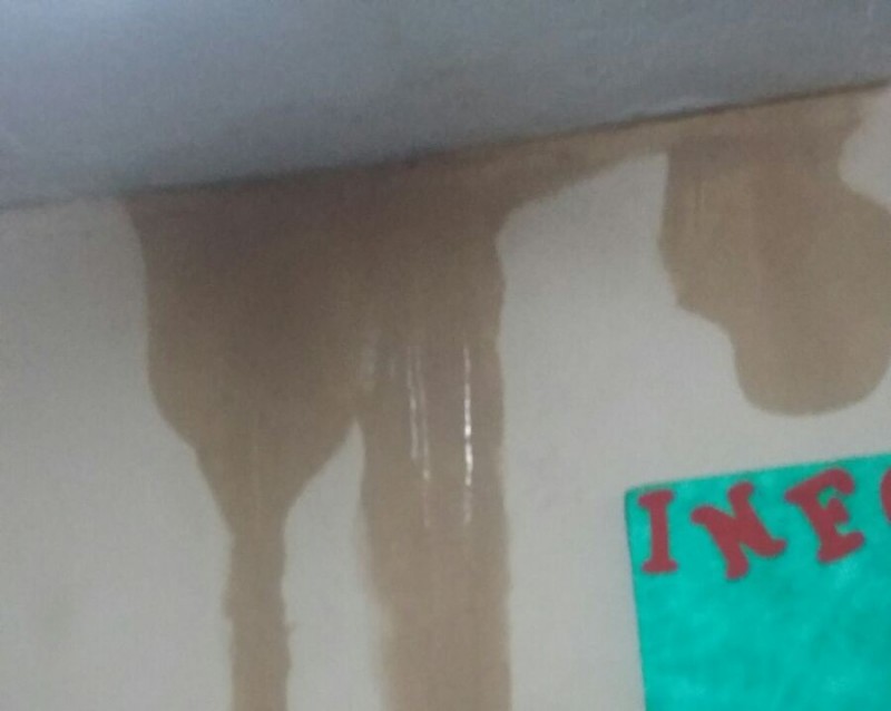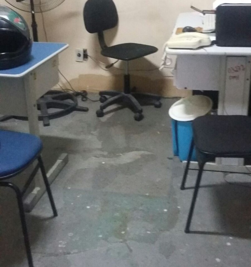 A água da chuva, descendo pelas paredes e criando poças d’água em algumas salas, com isso os servidores tiveram que afastar alguns objetos e mesas para não serem prejudicados com a água, também improvisar baldes para evitar que alagasse tudo.