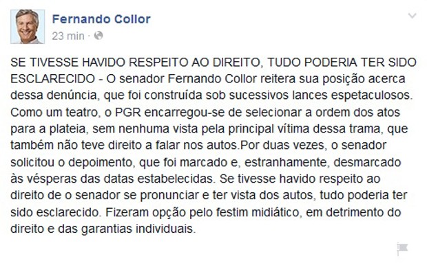 “O senador Fernando Collor reitera sua posição acerca dessa denúncia, que foi construída sob sucessivos lances espetaculosos. Como um teatro, o PGR [Janot] encarregou-se de selecionar a ordem dos atos para a plateia, sem nenhuma vista pela principal vítima dessa trama, que também não teve direito a falar nos autos”, escreveu a assessoria de Collor na rede social.