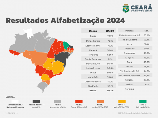 O Ceará, mais uma vez, supera a meta nacional e se mantém como o único estado brasileiro a alcançar 85% das crianças da rede pública alfabetizadas na idade certa em 2024. É o maior índice do País. No Brasil, 59,2% das crianças alcançaram o nível adequado de alfabetização, um avanço em relação a 2023 (56%). A meta nacional era de 60% para 2024. Os dados são do Indicador Criança Alfabetizada (ICA), divulgados pelo Ministério da Educação (MEC), nesta sexta-feira (11/07), em Brasília.