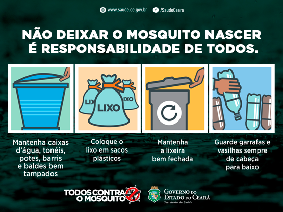 A pré-estação chuvosa no Ceará já dá seus primeiros sinais neste mês. Com as chuvas, mesmo que isoladas, aumenta o risco de proliferação do mosquito Aedes aegypti. Por isso, a Secretaria da Saúde do Ceará reforça o alerta à população para redobrar os cuidados no combate ao mosquito que transmite dengue, chikungunya e zika. É preciso não deixar o mosquito nascer.