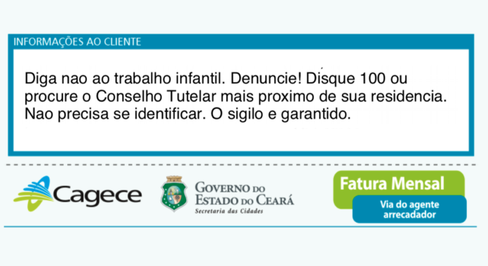 As contas de água da Companhia de Água e Esgoto do Ceará (Cagece) de junho deste ano estão circulando no estado com uma novidade importante: trazem os canais de denúncia de violação de direitos de crianças e adolescentes, uma forma de potencializar esses canais e tornar a atuação dos órgãos especializados ainda mais eficiente. A iniciativa é da deputada estadual Érika Amorim (PSD), terceira secretária da Mesa Diretora da Assembleia Legislativa.