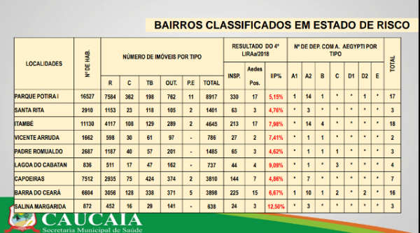 Em 2018, o município de Caucaia de maneira integrada vem continuamente investindo em ações de controle e combate ao AEDES AEGYPTI, gerenciado por meio do Comitê de Enfrentamento constituído órgãos da administração municipal e entidades parceiras com atuação social no município.