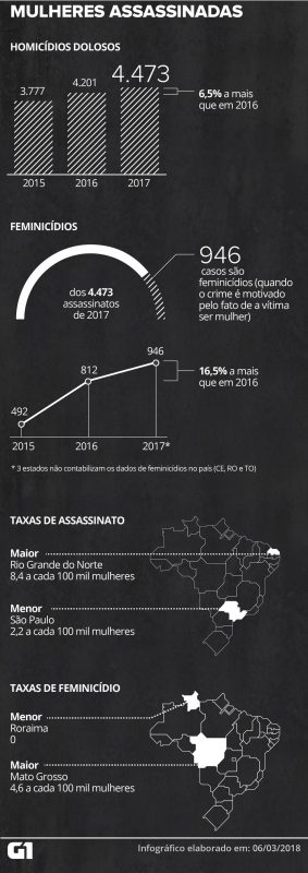 O Brasil teve 4.473 homicídios dolosos de mulheres em 2017 (um aumento de 6,5% em relação ao ano anterior)