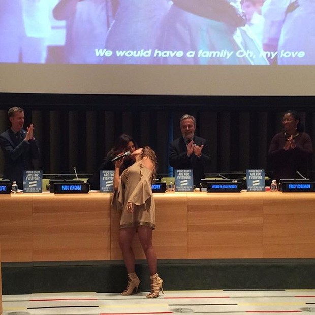“Seu beijo, minha alegria! Oh, Maria… O beijo gay na ONU, o dia do lançamento do videoclipe novo da Campanha Livres e Iguais. Um dia para celebrar o amor, um dia para celebrar a liberdade”, escreveu a cantora baiana em seu perfil na rede social Instagram.