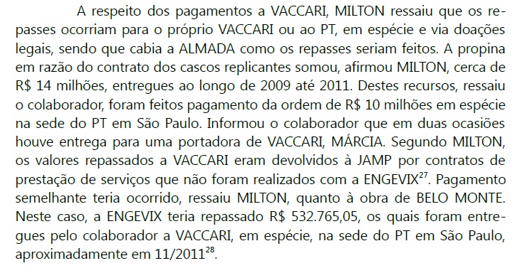 Sobre os R$ 10 milhões, o delator disse que ‘em duas ocasiões houve entrega para uma portadora de Vaccari, Márcia’. Segundo Pascowitch, os valores repassados ao ex-tesoureiro do PT eram devolvidos à Jamp Engenheiros por contratos de prestação de serviços que não foram realizados com a Engevix. “Pagamento semelhante teria ocorrido, ressaiu Milton, quanto à obra de Belo Monte”, diz relatório do Ministério Público Federal. “Neste caso, a Engevix teria repassado R$ 532.765,05, os quais foram entregues pelo colaborador a Vaccari, em espécie, na sede do PT em São Paulo, aproximadamente em 11/2011.”