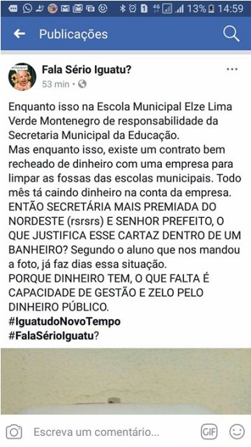 Sob a alcunha de “Fala Sério Iguatu?”, um profile no Facebook e protegido pelo anonimato estão sendo utilizado para promover ataques contra a administração municipal de Iguatu. A campanha difamatória começou há alguns dias, mas vem ficando mais virulenta na medida em que o tempo passa.