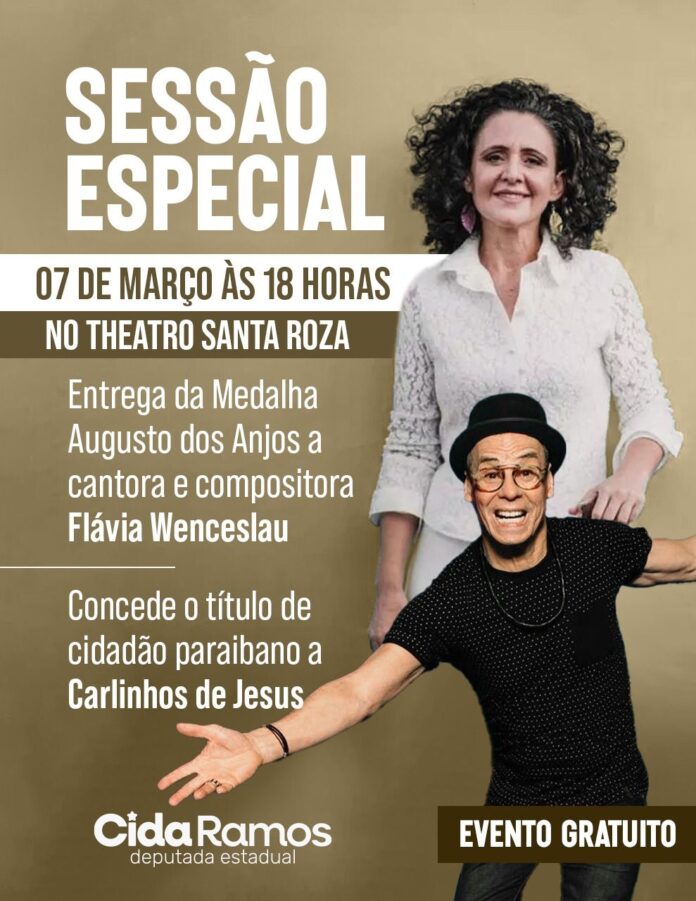 Dois artistas de projeção nacional serão homenageados pela Assembleia Legislativa da Paraíba (ALPB). O dançarino Carlinhos de Jesus, nascido no Rio de Janeiro, receberá o título de cidadão paraibano, enquanto a cantora paraibana radicada na Bahia, Flávia Wenceslau, receberá a Medalha Augusto dos Anjos. Ambas as homenagens são propostas da Deputada Cida Ramos (PT).