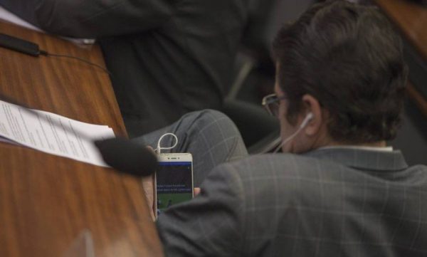 Victório Galli (PSL-MT) acompanha jogo da Copa do Mundo durante sessão da comissão de agrotóxicos – Daniel Marenco / Agência O Globo