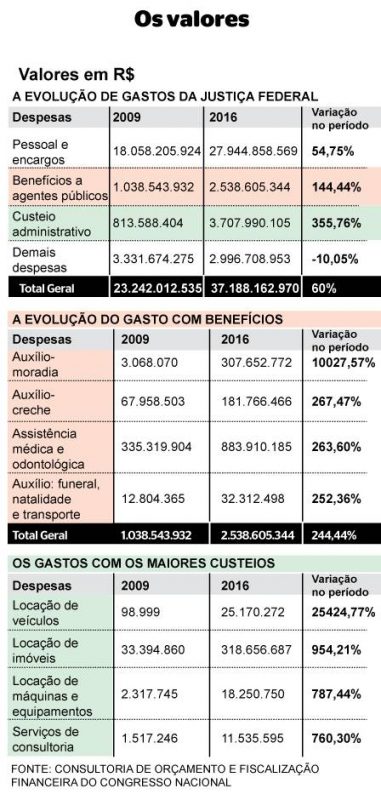 De 2009 a 2016, o Judiciário Federal estabeleceu novos parâmetros de gastos reservados aos pagamentos de auxílios e benefícios, e para o custeio administrativo dos seus órgãos vinculados. Dados obtidos pela Consultoria de Orçamento e Fiscalização Financeira do Congresso Nacional apontam que, no período, o gasto com benefícios disparou 144,44%. Já a despesa com custeio aumentou 355,76%. Os números estão sendo análisados pela Comissão da Câmara dos Deputados que trata do projeto do teto remuneratório do servidores.