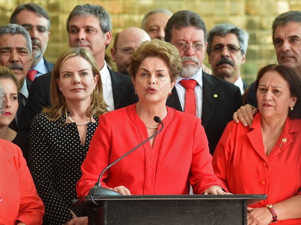 Ao lado de aliados, Dilma foi enfática: “Ouçam bem: eles pensam que nos venceram, mas estão enganados. Sei que todos vamos lutar. Haverá contra eles a mais firme, incansável e enérgica oposição que um governo golpista pode sofrer.”