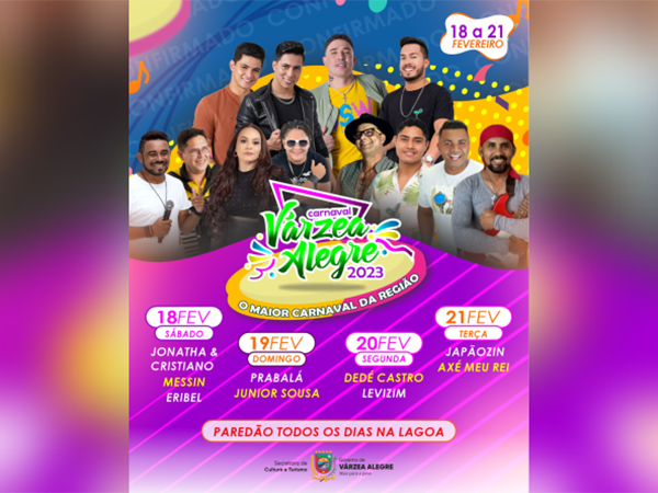 A secretaria de Cultura e Turismo, do Governo de Municipal, divulgou na manhã deste sábado, 11, as atrações do Carnaval de Várzea Alegre 2023.
