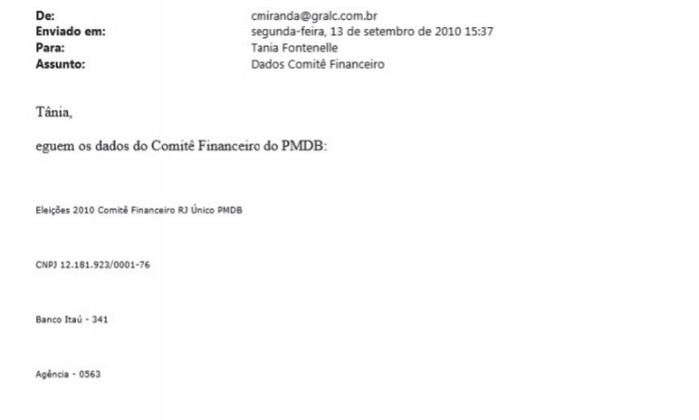 No e-mail enviado dia 13 de setembro de 2010, Carlinhos repassa os números das contas em que Tânia deveria depositar valores para o comitê financeiro do PMDB do Rio. Nove dias depois, em 22 de setembro, a Carioca fez uma doação de R$ 100 mil na conta do comitê do PMDB. No dia seguinte, a empresa repassou mais R$ 200 mil ao partido. A empresa já havia feito um repasse de R$ 130 mil à legenda em 20 de agosto de 2010.