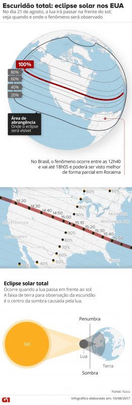 Esta segunda-feira (21), os moradores de uma faixa de terra dos Estados Unidos verão um sol negro. É o eclipse solar total, um dos fenômenos mais aguardados pela agência espacial americana (Nasa) neste ano. No Brasil, ele será visto de forma parcial — quanto mais ao Norte, mais coberto estará o sol.