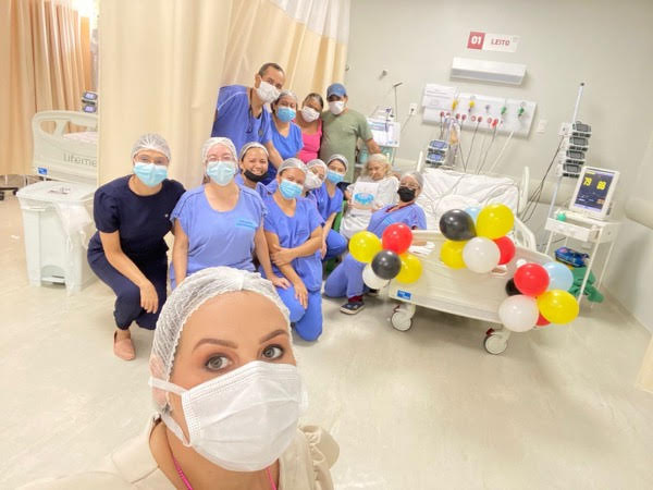 D. Francisca Damasceno recebeu todo o cuidado e carinho necessário para auxiliar na recuperação durante os 59 dias em que ficou internada na UTI do Hospital Municipal, por conta de um grande desconforto respiratório. Durante a internação, os profissionais realizaram até uma comemoração de aniversário para a paciente, dentro dos padrões de segurança de saúde de uma UTI. D. Francisca também realizou uma chamada de vídeo para os familiares em celebração à data, também acompanhada pelos profissionais. Já em casa, D. Francisca e os familiares já entraram em contato com a equipe do hospital para parabenizar e agradecer o atendimento prestado.