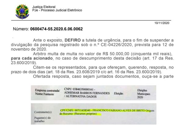 Diante dos fatos apontados, a Justiça Eleitoral entendeu pela suspensão liminar da pesquisa, arbitrando multa no valor de R$ 50.000,00 para cada acionado em caso de descumprimento da decisão.