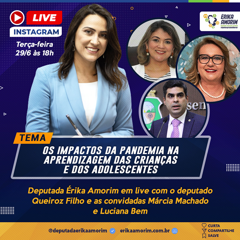 O mandato Juntos pra Melhorar promove, na próxima terça (29/6), às 18 horas, uma live especial sobre os impactos do ensino à distância na aprendizagem das crianças e dos adolescentes. A iniciativa é da deputada Érika Amorim (PSD), terceira secretária da Mesa Diretora da Assembleia Legislativa do Ceará.