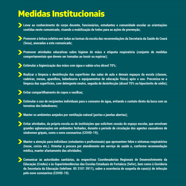 A nota esclarece que as escolas e os Centros Cearenses de Idiomas da rede pública estadual de ensino devem continuar suas atividades normalmente. Na ocorrência de qualquer mudança no cenário epidemiológico, que justifique a adoção de outras medidas de prevenção e controle dirigidas à comunidade escolar, haverá divulgação, em tempo hábil.