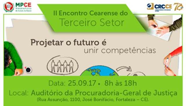 Estão abertas as inscrições para o II Encontro Cearense do Terceiro Setor: Projetar o futuro é unir competências, realizado pelo Ministério Público do Estado do Ceará (ESMP), por meio do Centro de Apoio de Fundações e Entidades de Interesse Social (CAOFURP), e pelo Conselho Regional de Contabilidade do Ceará (CRC/CE). O evento acontecerá no dia 25 de setembro de 2017, das 8h às 18h, no auditório da Procuradoria-Geral de Justiça (Rua Assunção, 1100 – José Bonifácio).