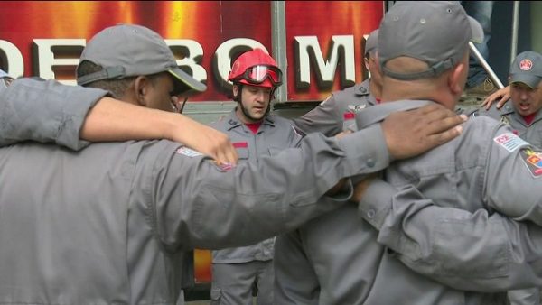 bombeiros que trabalharam nas buscas do prédio que desabou no Centro de SP se abraçam para fazer oração (Foto: Reprodução TV Globo)