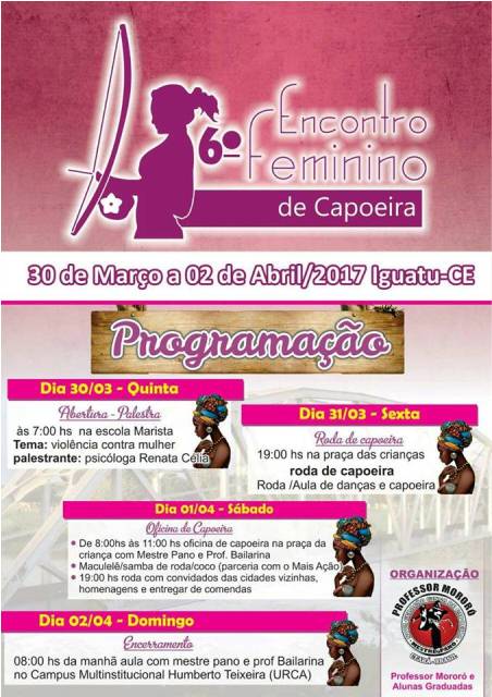 Entre os dias 30 de março a 2 de abril, Iguatu vai sediar a 6ª edição do encontro feminino de Capoeira, um dos maiores eventos de capoeira do estado do Ceará. A abertura do evento acontece no próximo dia 30, no colégio Marista do bairro João Paulo II, a partir das 7h, com a palestra que ira aborda o tema, “Violência contra a mulher”, com a psicóloga Renata Célia.