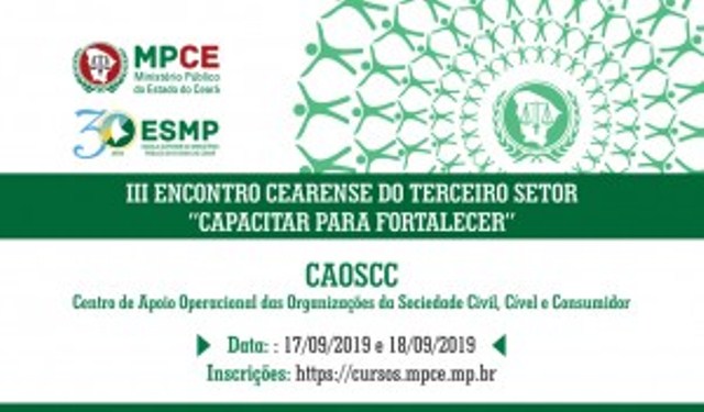 O Ministério Público do Ceará (MPCE), por meio do Centro de Apoio Operacional das Organizações da Sociedade Civil, Cível e Consumidor (Caoscc), realiza nesta terça (17/09) e quarta-feira (18/09), das 9h às 17h, o “III Encontro Cearense do Terceiro Setor”.