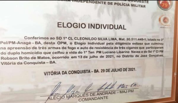 O Instituto Cigano do Brasil-ICB, vem a público expressar sua indignação e repúdio- Elogio Individual trecho que diz “Pela diligência exitosa que culminou na apreensão de três armas de fogo e mortes de três Ciganos”.