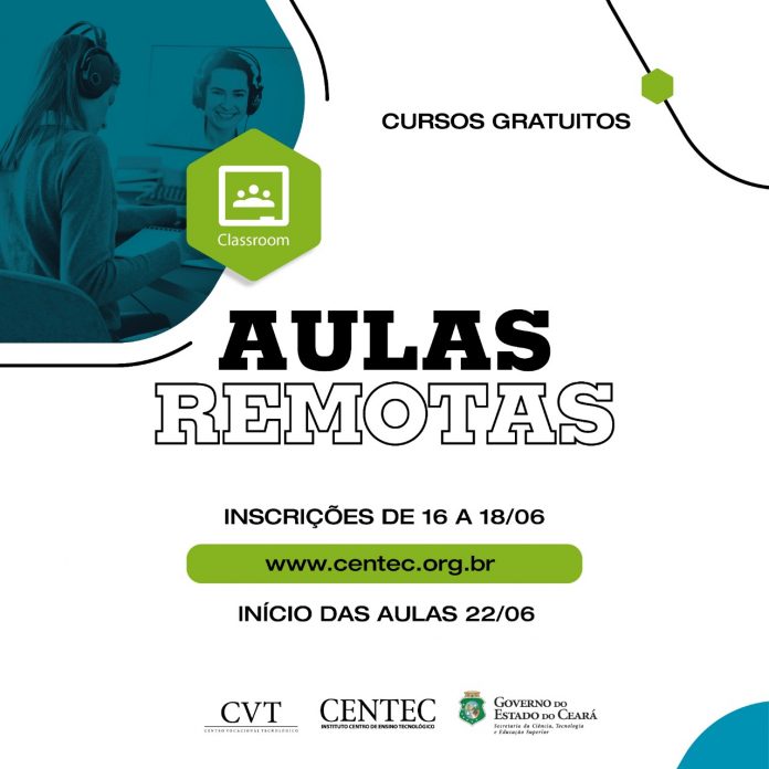 O Instituto Centec está com inscrições abertas, de 16 a 18 de junho, para cinco cursos dos Centros Vocacionais Tecnológicos (CVT) que serão oferecidos através de aulas remotas. A ação faz parte de um amplo planejamento institucional para dar continuidade aos cursos de qualificação profissional de jovens e adultos, ofertados em parceria com a Secretaria Estadual da Ciência, Tecnologia e Educação Superior (Secitece), de forma emergencial durante o período de isolamento social.